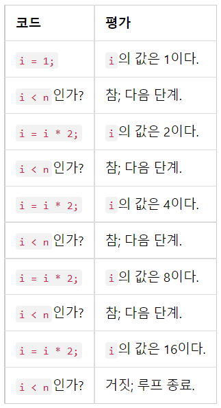 즉 제어식 (i < n)이 참이면 루프는 계속 돌아감.
