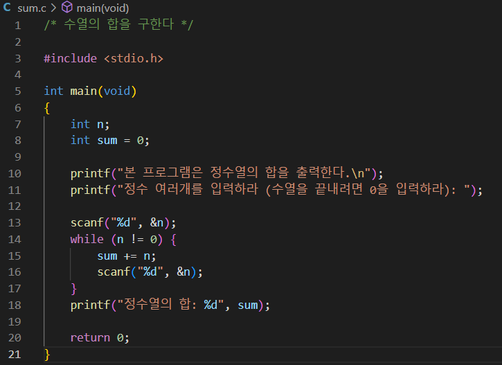 눈치가 빠르면 scanf로 숫자를 읽어야 할 때, 수열의 합을 구할 때 루프가 필요해보일 것임.