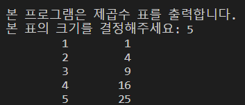 제곱수를 표 형식으로 출력하는 프로그램을 만들어볼 것임.