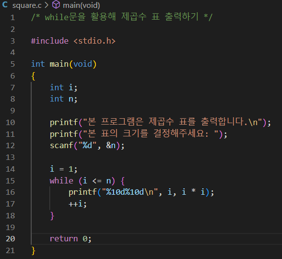 제곱수를 출력하고 싶은 만큼의 개수를 n이라는 변수에 저장할 것임.