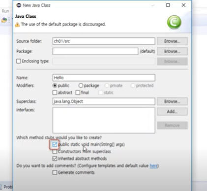 첫번째 체크박스 클릭. 그럼 메인 메서드가 만들어짐.